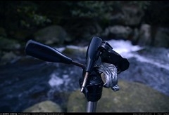 唉,無言啊,一隻三腳架跟著我的雙腳在溪中來來回回,除了正事之外還要被充當成登山杖、趕蛇棍,有時還會被丟進溪水裡完全沉入水中。傷痕累累之後,終於斷了。拍這一張照片時,我將小溪石卡進無法轉緊的雲台,然後拿出強力布膠帶綑死才拍成的。拍完這張,在眼前等著的是-早上那段爬滿黃藤的雜草山路以及冷泉上方的驚險的涉水。
